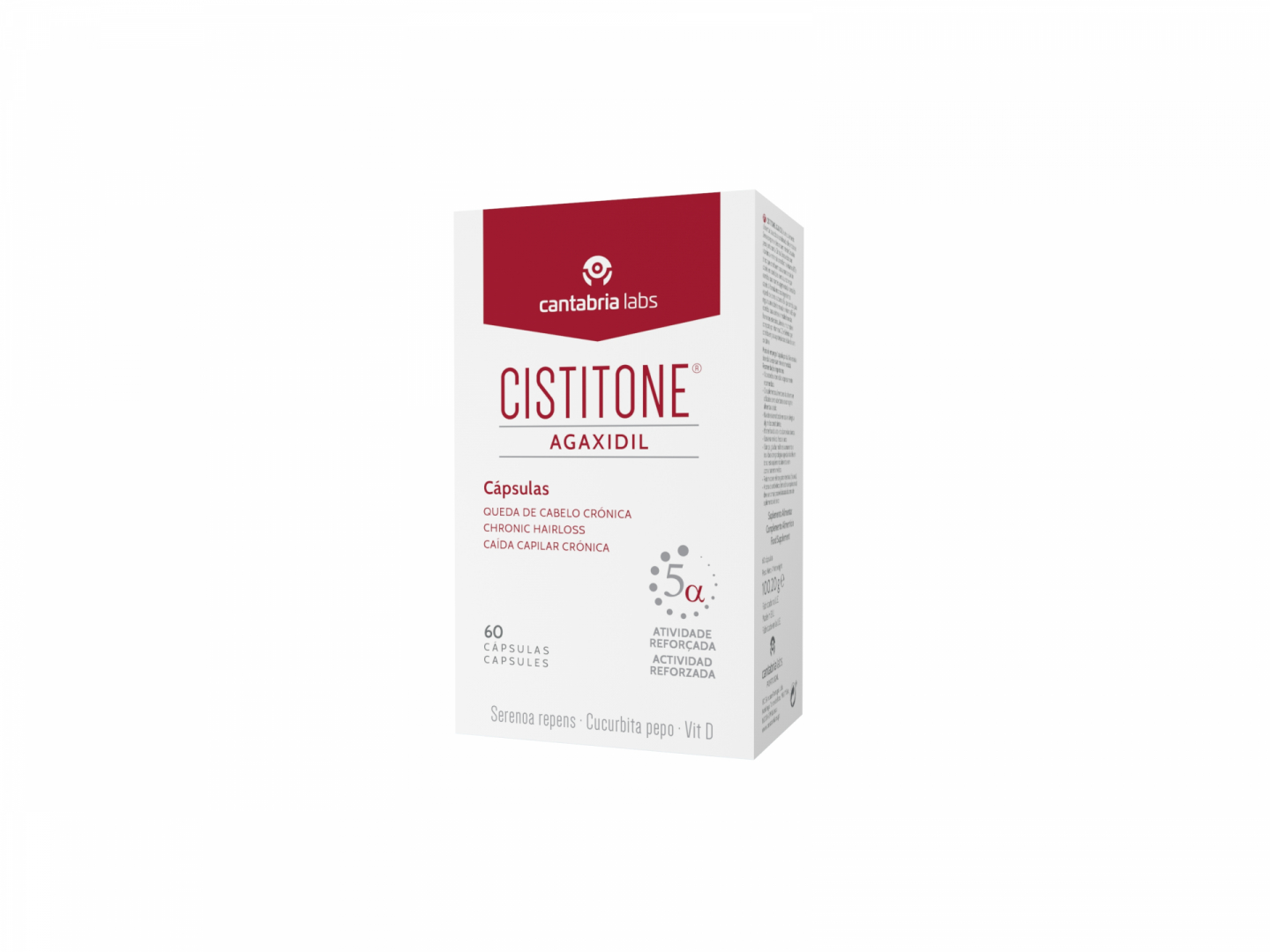 Incorpora Serenoa repens e Cucurbita pepo, dois ingredientes suportados cientificamente que atuam especificamente sobre a queda capilar crónica severa. Exerce uma ação integral, pois a sua fórmula é enriquecida com vitaminas e minerais que contribuem para a manutenção do cabelo em condições normais, tais como Biotina, Zinco e Cobre, em conjunto com a Cistina, elemento importante constitutivo da fibra capilar.